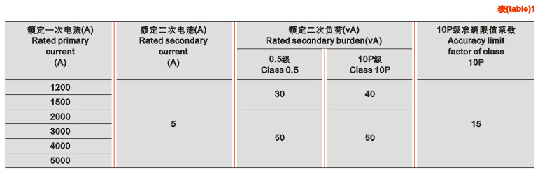 4.额定一次电流、准确级、额定输出及额定短时电流见表