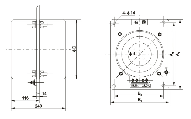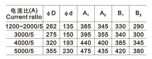 本型电流互感器为母线式穿墙结构;铁心为圆环形,二次绕组均匀地绕在铁心上,用环氧树脂浇注成型,浇注体固定在铝合金的穿墙面板上,其上有名牌,接地螺栓及四个安装孔
