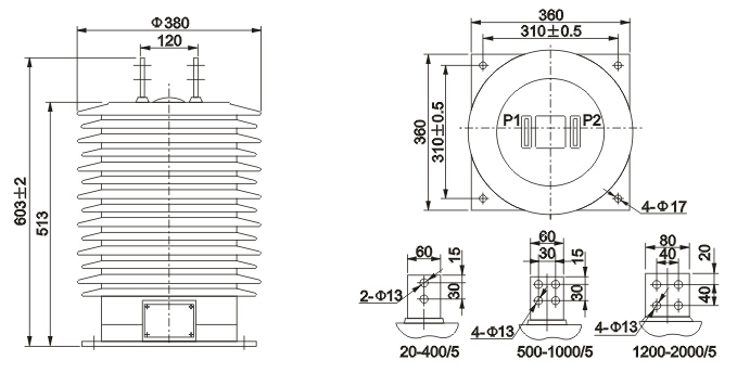本系列电流互感器为全封闭支柱结构,外绝缘采用户外专用环氧树脂(瑞士CIBA,CW5837),具有耐电弧、耐紫外线、耐老化、寿命长、爬电距离大、局部放电量小、抗过电压能力强等特点。一次绕组和二次绕组及其铁心组合在一起的器身封闭在环氧树脂混合料的浇注体内,一次P1、P2端由产品顶部引出,二次S1、S2端由产品下部密封的出线盒引出。