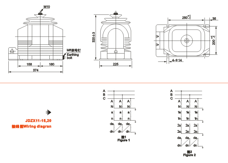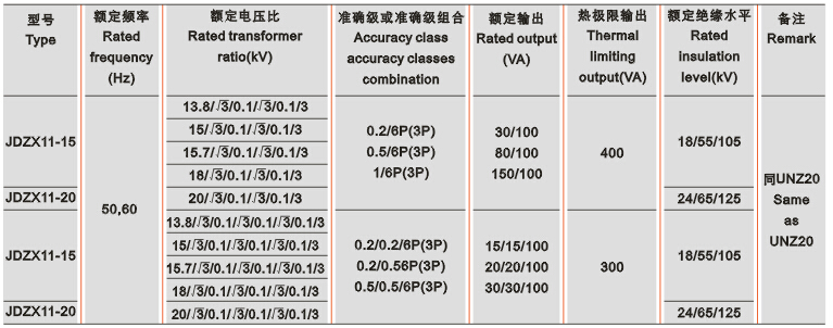 JDZX11-15、20电压互感器为环氧树脂浇注绝缘全封闭产品,适用于额定频率50HZ或60HZ、额定电压15,20KV及以下电力系统中,作电能计量、电压监测和继电保护用。本产品符合IEC186及GB1207-1997《电压互感器》标准