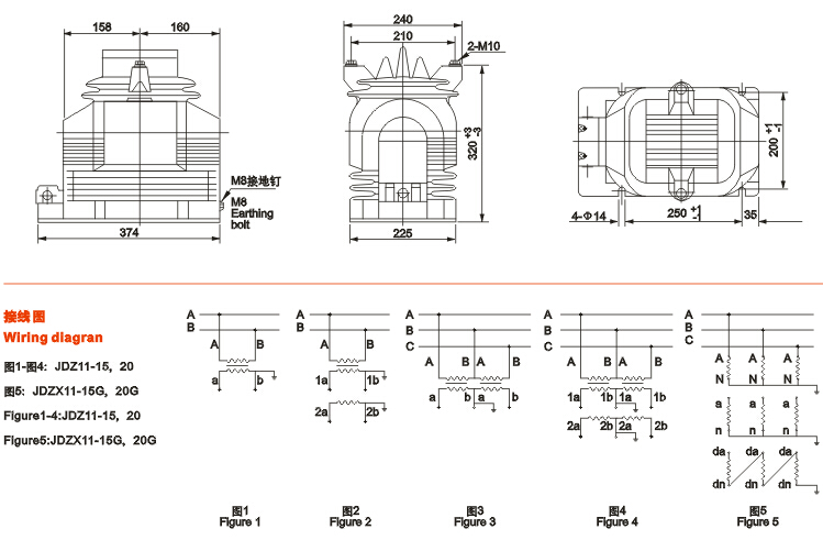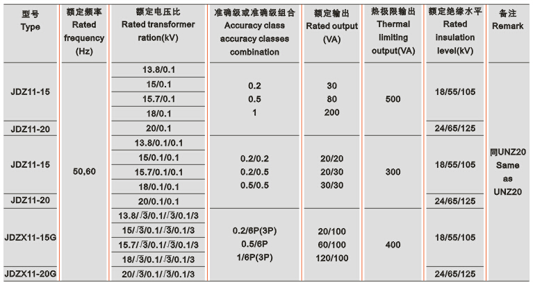 JDZ(X)11-15G、20G电压互感器为环氧树脂浇注绝缘全封闭产品,适用于额定频率50HZ或60HZ、额定电压15,20KV及以下电力系统中,作电能计量、电压监测和继电保护用。本产品符合IEC186及GB1207-1997《电压互感器》标准