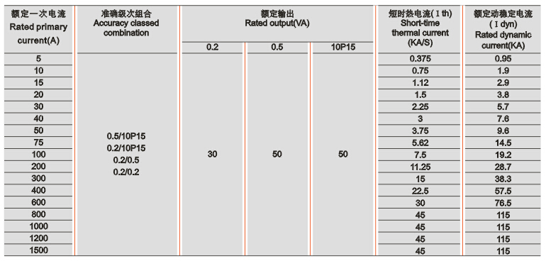 3.额定一次电流、准确级组合、额定输出及动热稳定电流见表;