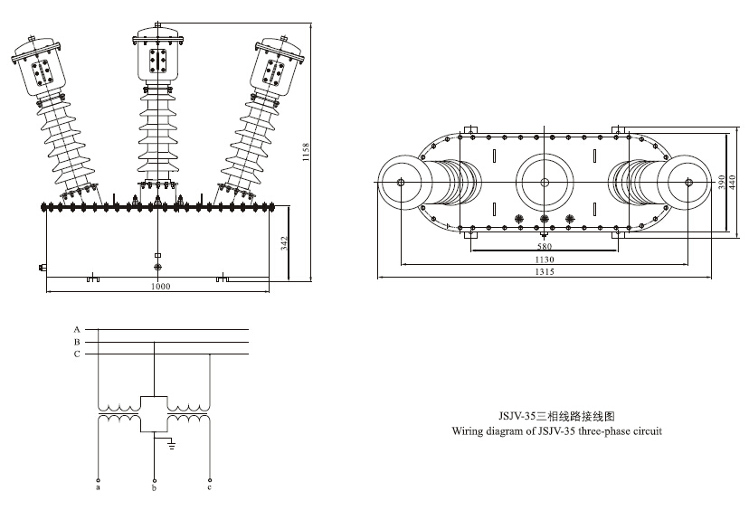 JSJV-35GYW1电压互感器为三相油浸全绝缘产品,适用于额定频率50HZ或60HZ、额定电压35KV的电力系统中,作电能计量、电压监测和继电保护用。