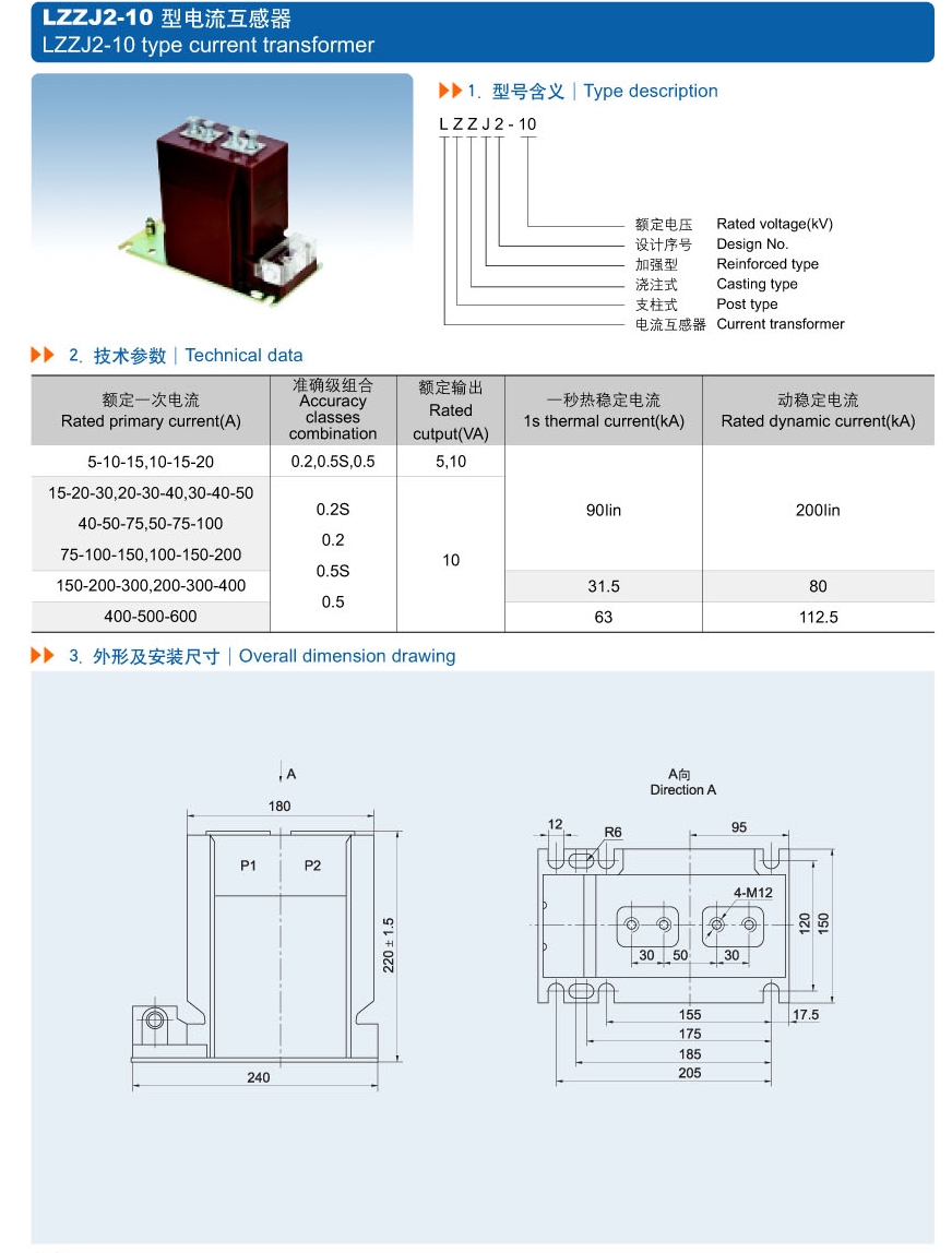 LZZJ2-10电流互感器为环氧树脂浇注绝缘全封闭产品,适用于额定频率50Hz或60Hz、额定电压10kV及以下的电力系统中,作电能计量、电流测量和继电保护用。本产品符合IEC60044-1及GB1208《电流互感器》标准。