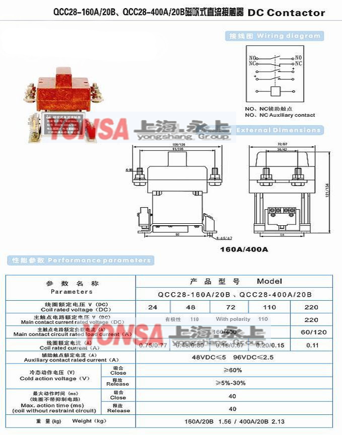 QCC系列直流接触器主要用于铁路机车电暖器、电热水器、电烤箱、打温装置和机动车、高尔夫球车、电动摩托车以及邮电通信和计算机领域的电源切换和控制,产品符合TB1333-1996《机车电器基本技术条件》及GB14048.4-93《低压开关设备和控制设备低压机电试接触器和电动机起动器》。