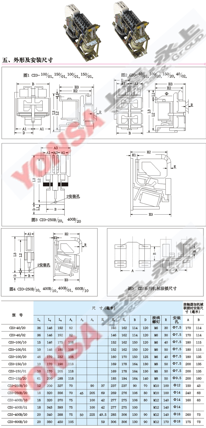 CZO系列直流接触器(以下简称接触器)主要供远距离接通与分断额定电压至440伏,额定电流至600安培的直流线路之用。并适用于频繁起动、停止直流电动机及直流电动机的换向或反接制动。(如:用于冶金,机床等电器控制设备中)