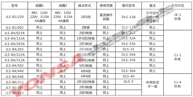本系列产品安装尺寸与DLS-10B、DLS-30A型完全相同,可直接替代。DLS-40F、DLS-5系列产品由于体积庞大,在使用中不方便,可采用JLS-86系列中接点形式一致而体积小的产品替代。当继电器线圈分别励磁动作时,一组触点闭合,另一组触点断开,继电器在任何情况下保持一种状态。继电器的可动系数由磁钢保持。