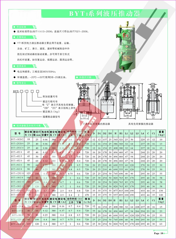BYT1系列隔爆型电力液压推动器是一种集电机、离心泵、油缸为一体、结构紧凑的驱动控制装置,广泛用作各种块式制动器和盘式制动器的驱装置,还可用于各种工业阀门、闸门,定向摆动和转动(<90°)装置及夹紧装置的驱动控制。