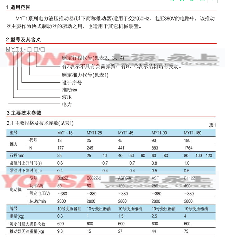 MYT1系列电力液压推动器主要用于YWZ系列操动闸瓦制动器,作为起重、运输、行车等驱动装置的机械制动用。