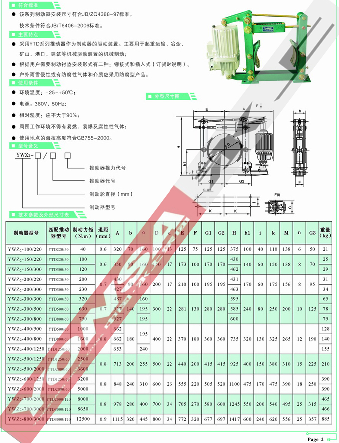 YWZ2系列液压块式制动器,采用YTD系列推动器作为制动器的驱动装置。主要用于起重、运输、冶金、矿山、港口、建筑机械驱动装置的机械制动。
